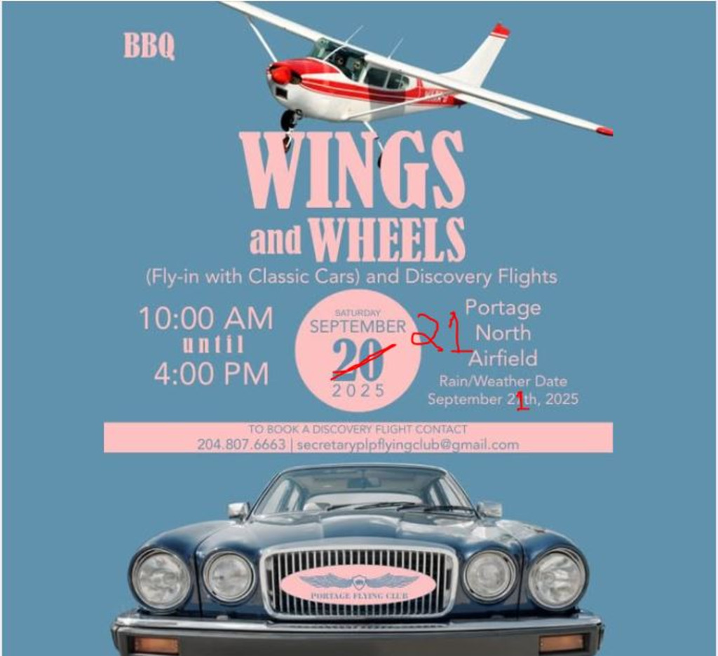 Due to poor flying weather anticipated, The Portage Flying Club will host our annual Wings and Wheels event on Sun 21 Sept from10am-4pm at the Portage North Airfield. Aircraft will fly in for a meet and greet with discovery flights by donation while Classic Cars will be there for a show n shine and silent auction.