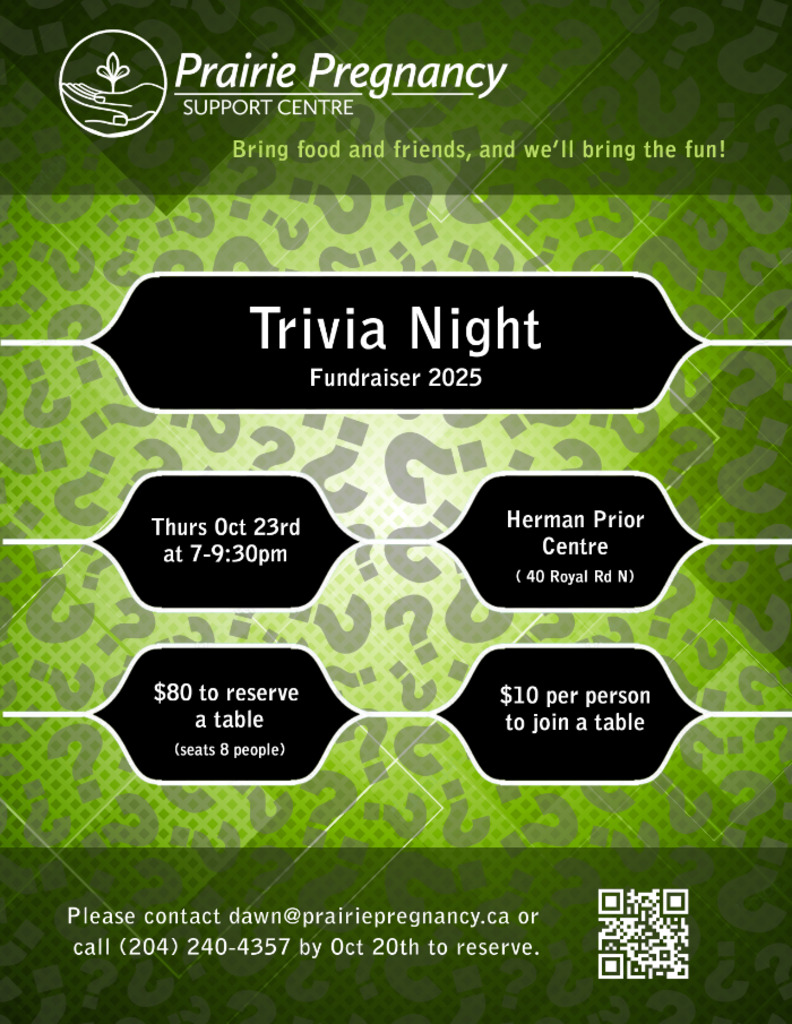 Prairie Pregnancy Support Centre, a local community care organization that provides pregnancy-related support services, will be hosting a trivia night fundraiser on Thursday, October 23rd from 7-9:30pm at the Herman Prior Centre. Trivia will feature questions spanning the decades, and teams of friends, family or co-workers can register to join the challenge. The evening promises to be one of fun and fellowship!