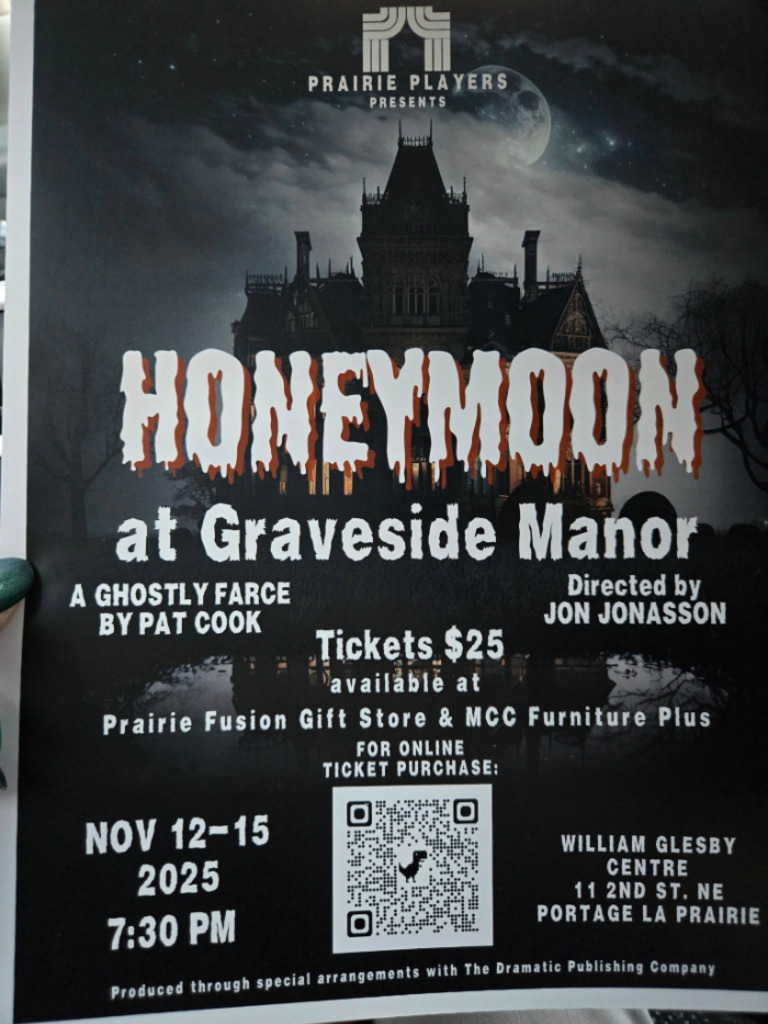 Prairie Players will perform the comedy, "Honeymoon at Graveside Manor", directed by Jon Jonasson, on Nov 12 - 15, 2025 at the Glesby Theatre in the Prairie Fusion Arts and Entertainment Centre. Doors open at 7pm and show at 7:20pm.Tickets are $25.00 each and available, cash only, at the Prairie Fusion Gift Shop and Portage MCC Furniture Plus.