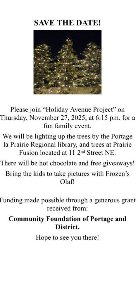 Please join us as we light up the trees at the city library and Prairie Fusion. Bring the kids for hot chocolate and photos with Olaf ⛄️