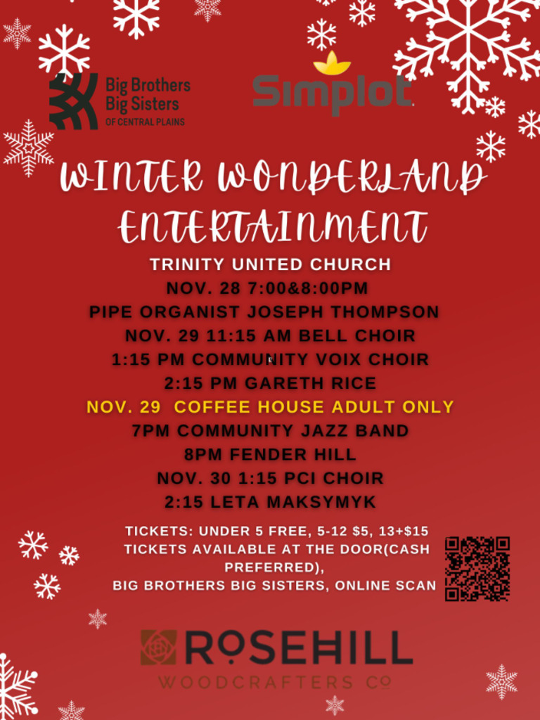 A unique winter event for everyone. Trinity United Church will be decorated top to bottom in winter and Christmas themes. There will be entertainment, gingerbread, quilts, a train, snowman alley, Elsa, Auna, the Grinch and of course Santa. There is so much to see and do, we don't want to give it all away. We hope you will join us
