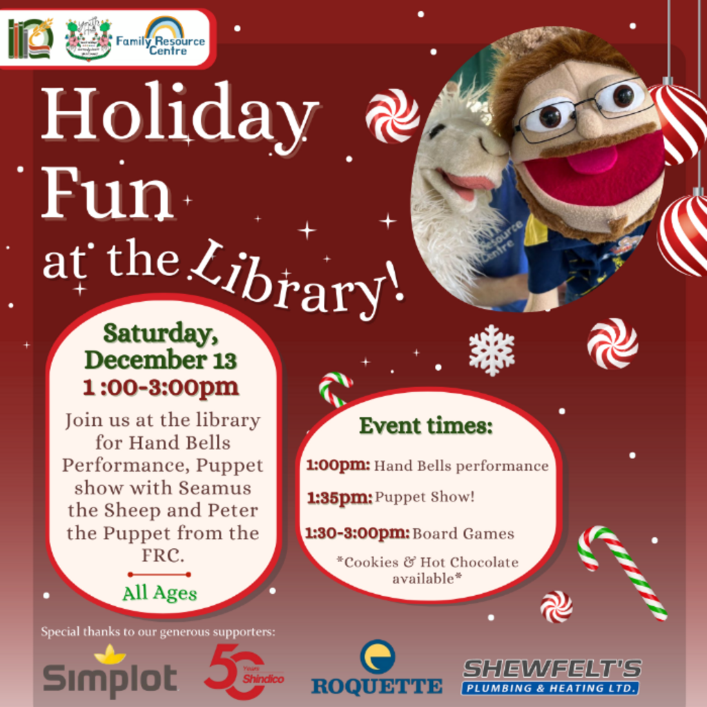 Enjoy a hand bell demonstration and a Puppet show featuring ‘Peter the Puppet’ from the Family Resource Centre and ‘Seamus the Sheep’ from the library!