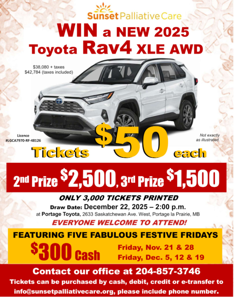We will have six private rooms dedicated to palliative care in the new hospital along with a rooftop garden, family room and comfort cart. FUNDS RAISED FROM THIS RAFFLE WILL HELP COVER COSTS OF THESE PROJECTS. Your $50 ticket purchase gives you a 1/3000 chance to win Toyota Rav4, plus many other draws. Tickets available at Sunset Palliative Care office or by sending an e-transfer to info@sunsetpalliativecare.org and we'll send you a photo of your ticket. Please include your phone number in the message. For more information contact our office at 204-857-3746.