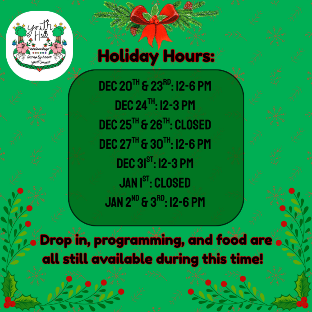 We will be on reduced hours from December 20th to January 3rd. We are open 12 to 6pm on those days (12 to 3pm on Christmas Eve and New Year’s Eve) and we will have drop-in programming available!