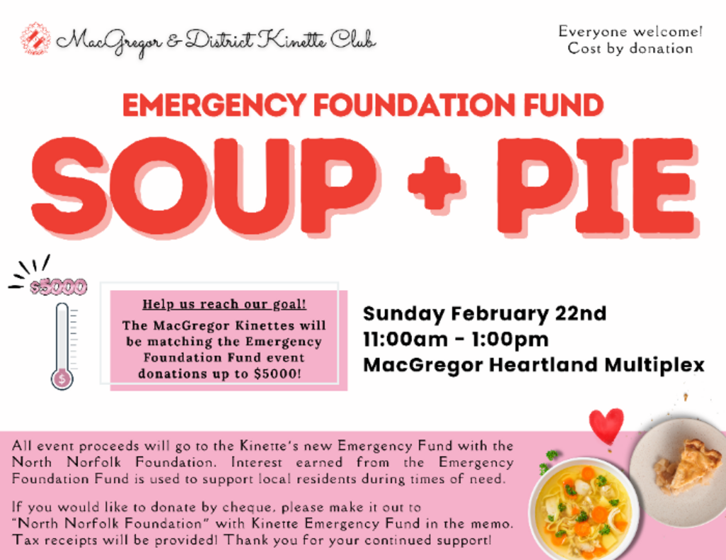 The MacGregor Kinette's annual Emergency Fund Soup + Pie fundraiser will be on Sunday February 22nd from 11:00am to 1:00pm at MacGregor's Heartland Multiplex!