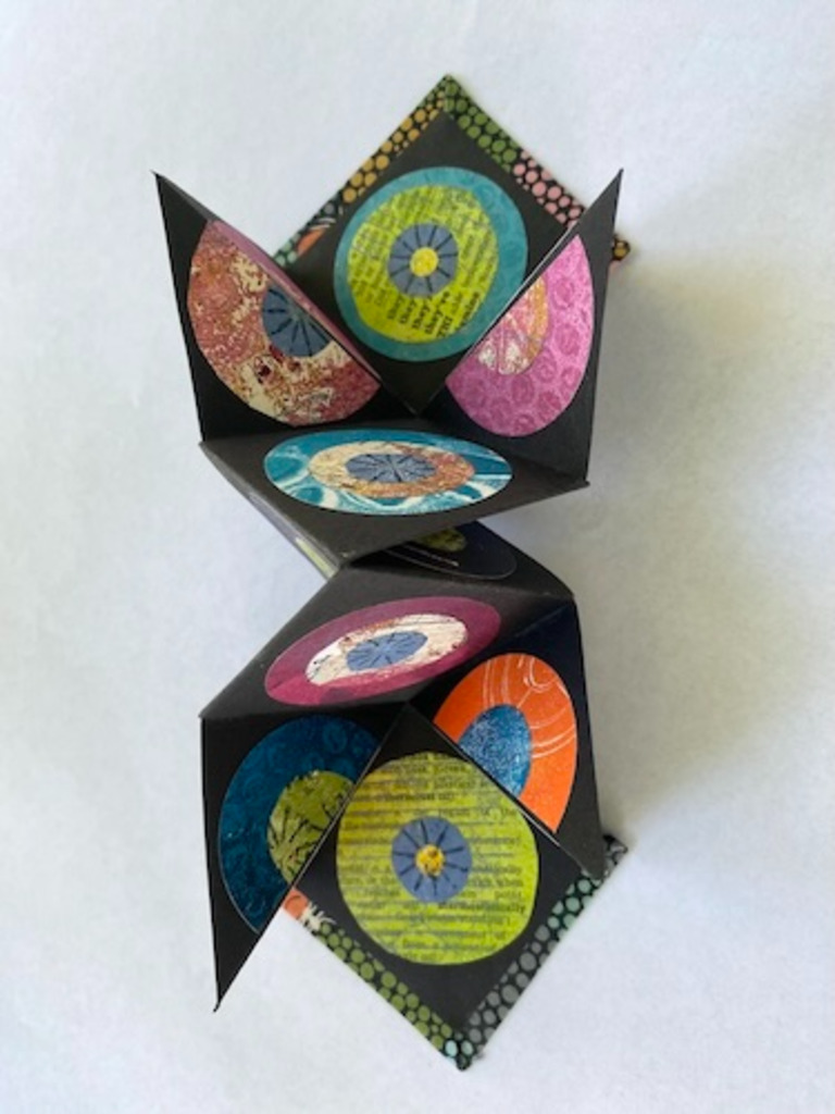 In the first half of this workshop participants will create a collection of unique printed papers using a gel-plate and acrylic paint. In the second half, an origami- folded book will be made. The end result “explodes” into a joyful creation of colour and pattern.