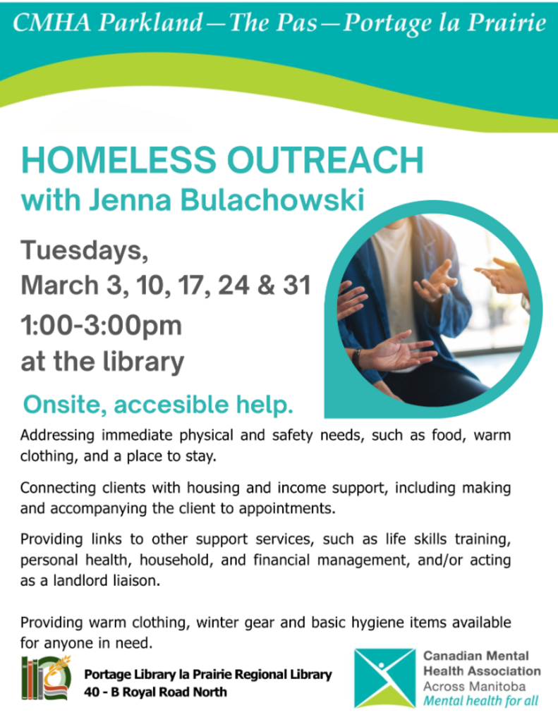 Drop into the library to chat with Jenna from CMHA. Get help with immediate needs like food, warm clothing, and shelter, along with support connecting to housing, income assistance, appointments, and other services such as life skills, health, financial management, and landlord support.
