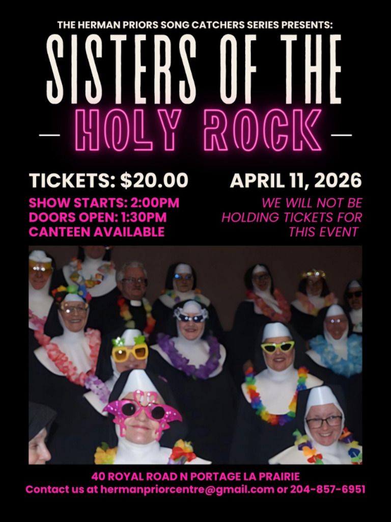 Inspired by the1992 "Sister Act" film the Sisters of the Holy Rock are an incredible group of volunteer performers based in Manitoba who mix powerful harmonies with amazing choreography. Described as talented and teasing, serious and silly, faithful and frolicking, holy and hilarious it is sure to be an entertaining show! Tickets will be available at the Herman Prior front desk.