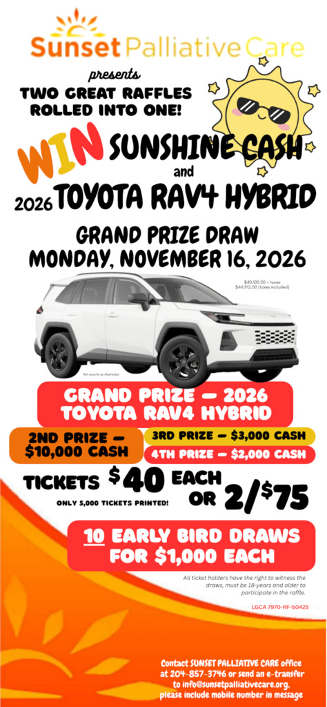 Tickets $40 each or 2/$75. To purchase yours please contact our office at 204-857-3746 or send an e-transfer to info@sunsetpalliativecare.org, please include mobile phone number in the message.